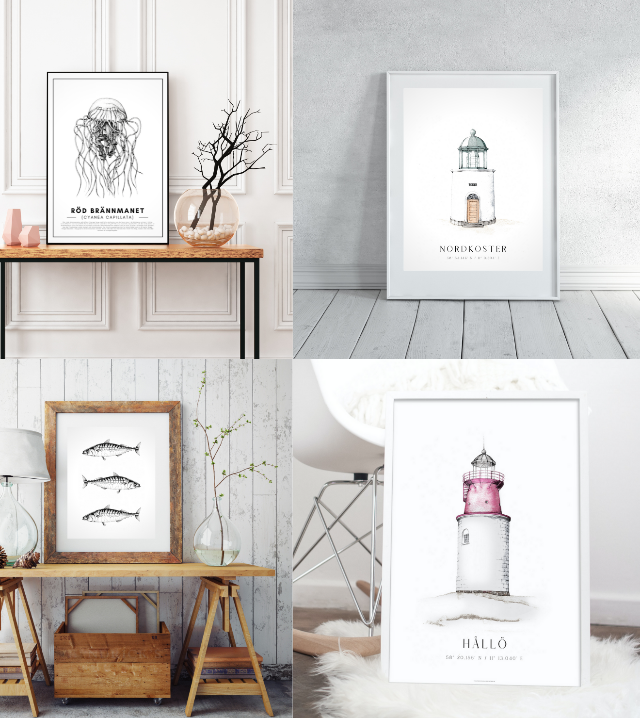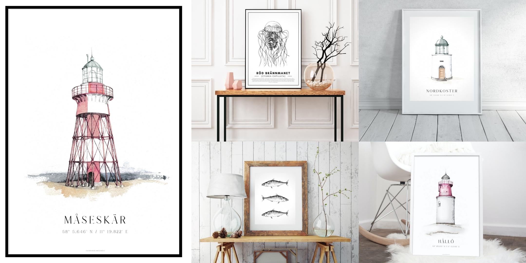 Med våra produkter kan du med enkla medel få in skärgårdsmiljön i ditt egna hem och återskapa känslan av kobbar och skär, vågor och hav, fisk och skaldjur. Våra västkustinspirerade posters passa perfekt i såväl vardagsrummet och köket som i sommarstugan och sjöboden.