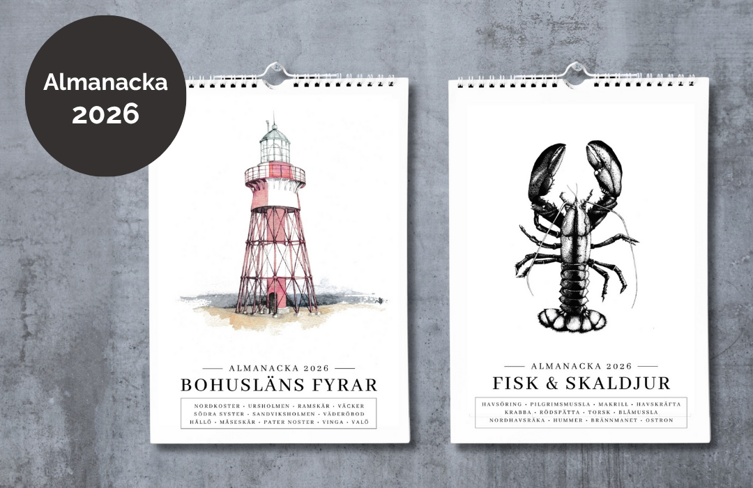 Våra stilrena väggkalendrar för 2026 har 12 handmålade illustrationer – välj mellan Bohusläns fyrar eller fisk & skaldjur från västkusten.